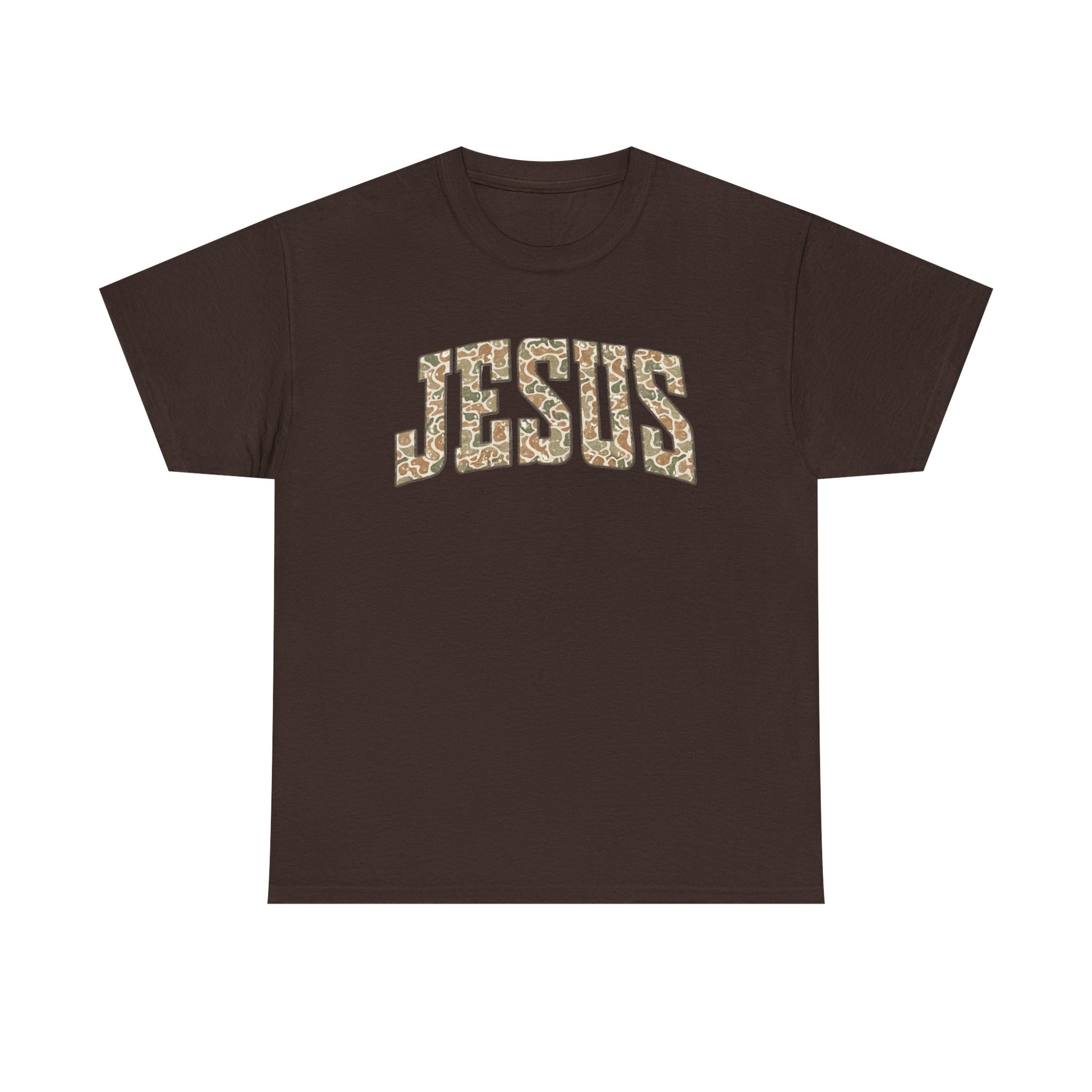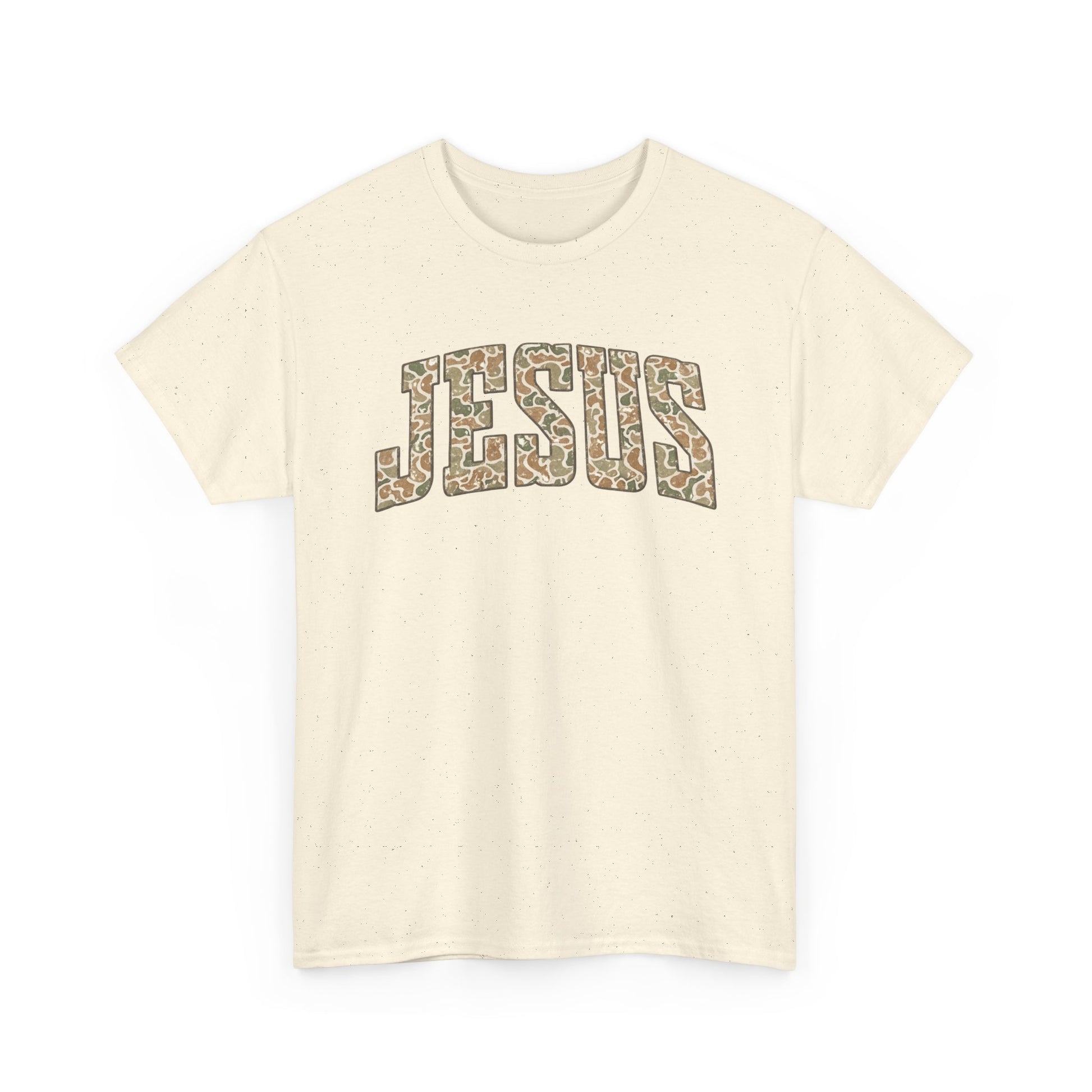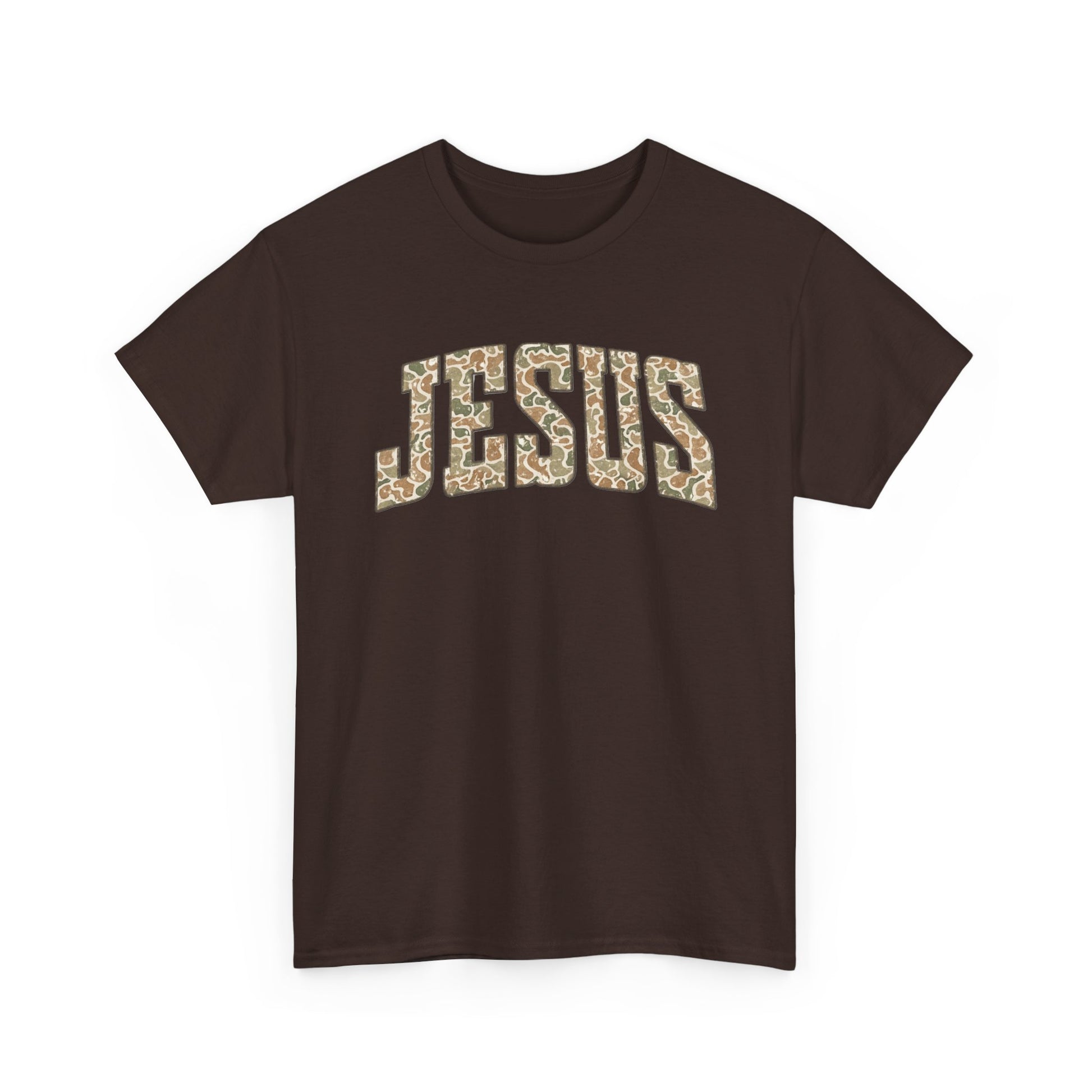 This relaxed crewneck tee puts faith front and center with a bold, collegiate-style JESUS arch rendered in a warm, textured print. The sturdy yet soft 100% cotton body feels familiar the moment you slip it on — breathable for everyday wear and substantial enough to hold its shape. Wear it to church, volunteer days, or casual meetups; it blends quiet devotion with everyday street-ready style. The clean back keeps the focus on the front message, while the tear-away label and ribbed collar keep comfort high all day. This shirt settles easily into routines: layered under a jacket for cooler mornings, or paired with jeans and sneakers for weekend walks and coffee runs.