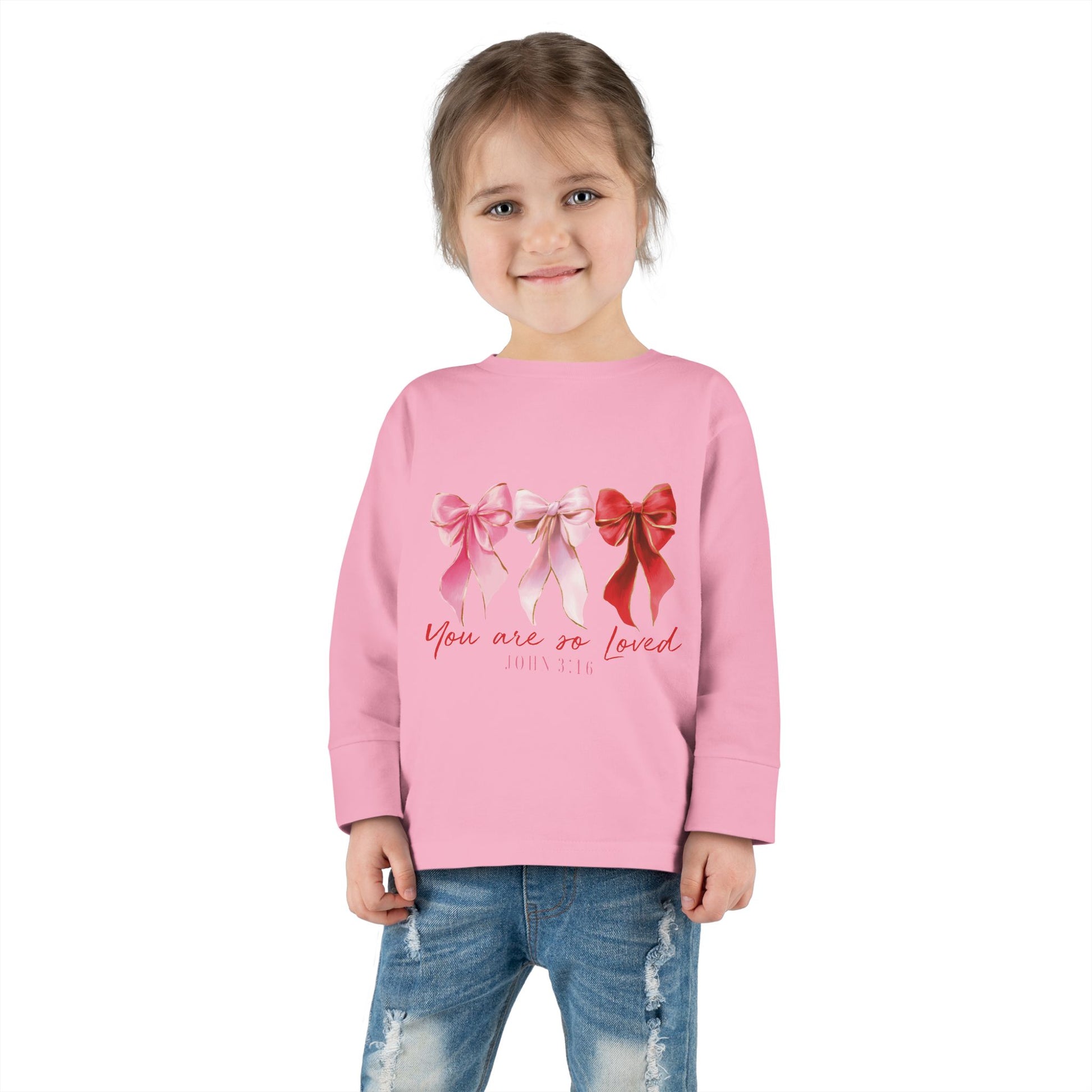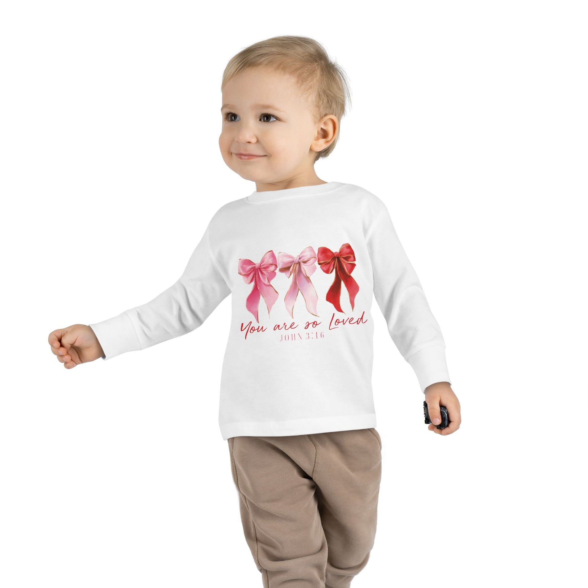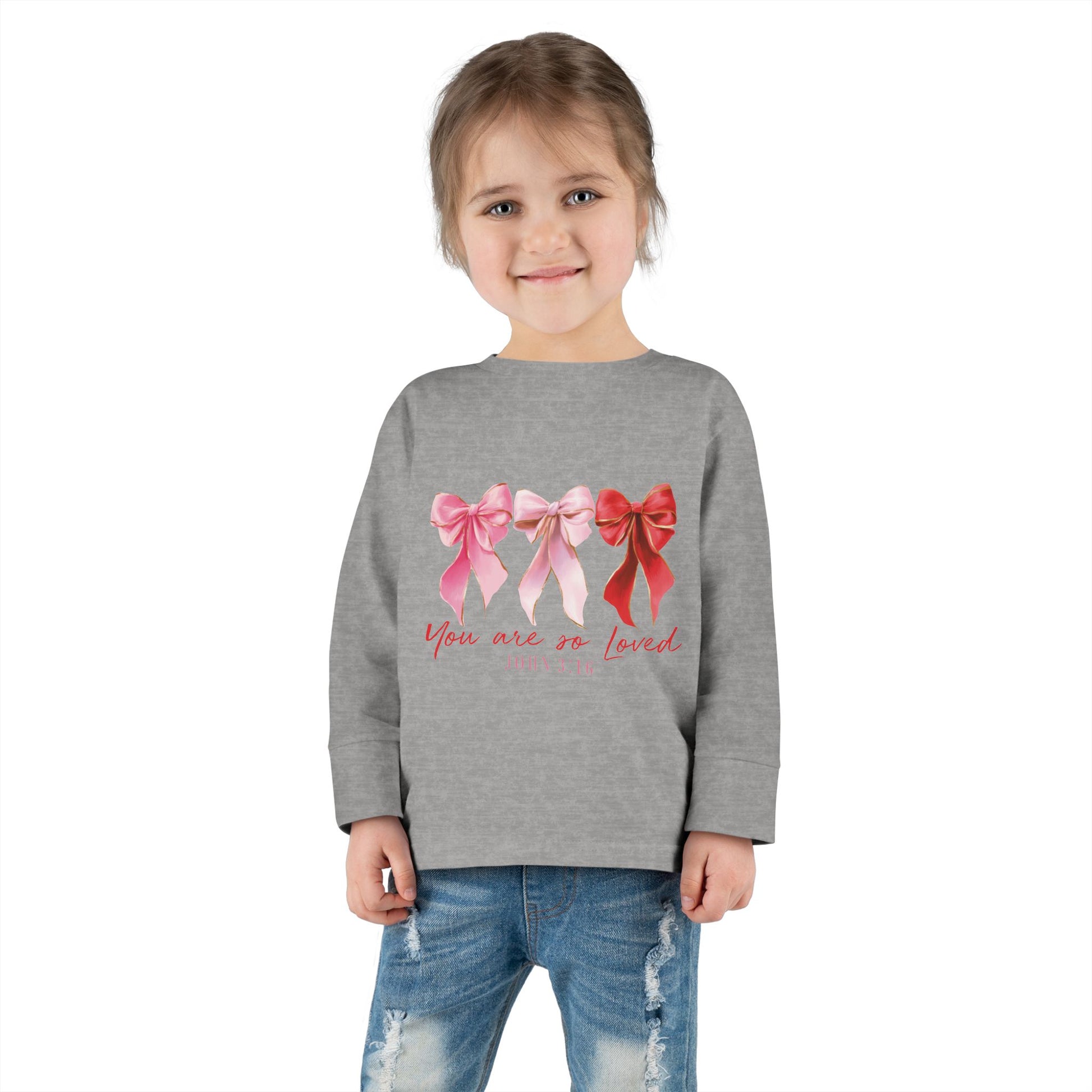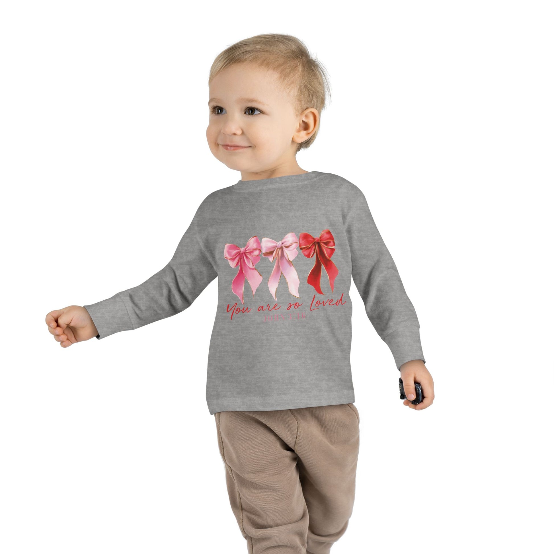 Soft, light, and endlessly sweet — this toddler long sleeve tee brings gentle charm to little wardrobes. Three watercolor bows in graduating pinks and red float across the chest, paired with delicate script below for a subtle, hand-painted look. The lightweight knit keeps active toddlers comfortable through playdates and nap time, while ribbed cuffs and neck maintain shape wash after wash. It layers easily under sweaters or wears alone on crisp mornings, adding a tender, feminine touch without fuss. This shirt suits everyday moments, family photos, and cozy celebrations where little details make memories.