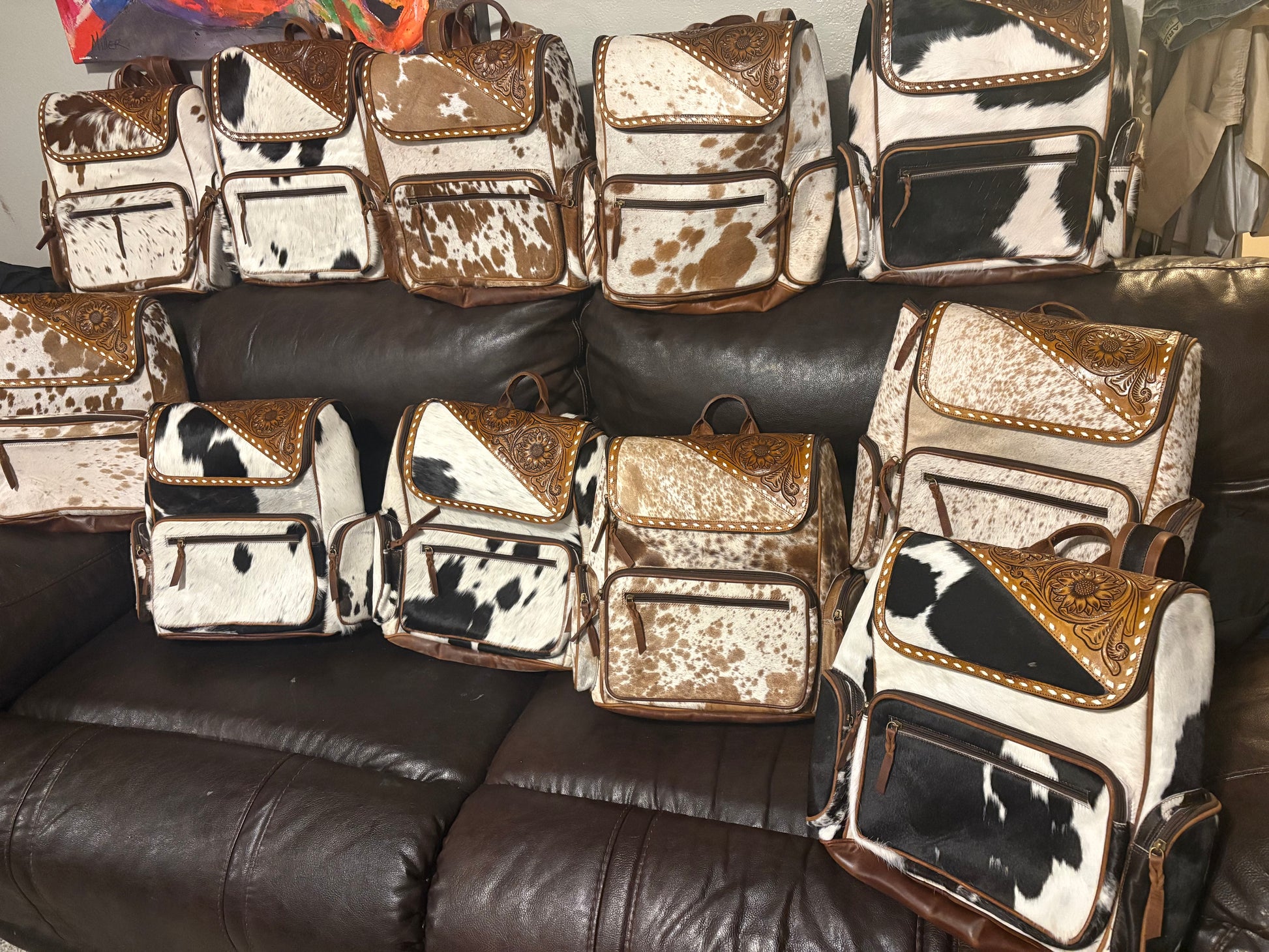 Turn heads everywhere you go with our exclusive handcrafted cowhide backpacks, each featuring real hair-on hide and genuine tooled leather detailing. Every single piece is one-of-a-kind, showcasing the unique patterns and natural textures of the hide.